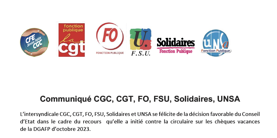 L’intersyndicale CGC, CGT, FO, FSU, Solidaires et UNSA se félicite de la décision favorable du Conseil d’Etat dans le cadre du recours qu’elle a initié contre la circulaire sur les chèques vacances de la DGAFP d’octobre 2023.