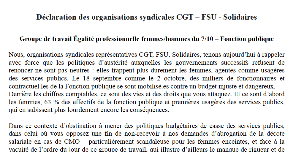 Nous, organisations syndicales représentatives CGT, FSU, Solidaires, tenons aujourd’hui à rappeler avec force que les politiques d’austérité auxquelles les gouvernements successifs refusent de renoncer ne sont pas neutres : elles frappent plus durement les femmes, agentes comme usagères des services publics. Le 18 septembre comme le 2 octobre, des milliers de fonctionnaires et contractuel.les de la Fonction publique se sont mobilisé.es contre un budget injuste et dangereux.