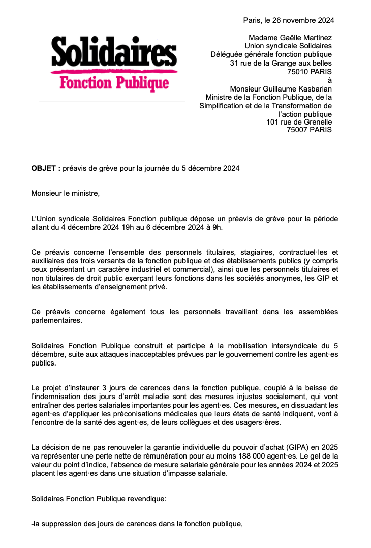 L’Union syndicale Solidaires Fonction publique dépose un préavis de grève pour la période allant du 4 décembre 2024 19h au 6 décembre 2024 à 9h.