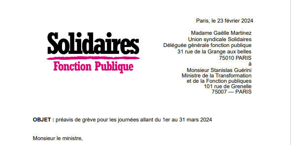 L’Union syndicale Solidaires Fonction publique dépose un préavis de grève pour les journées allant du 1er au 31 mars 2024 (de 0 h à 24 h).