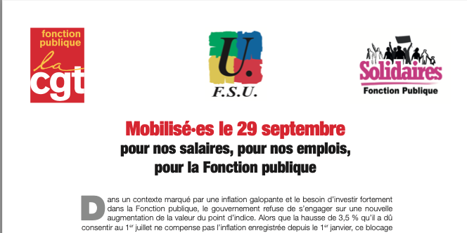 Les luttes sectorielles sont nombreuses, qui permettent de gagner des avancées. Nous avons aussi besoin d’élever le niveau du rapport de force au plan national pour gagner des mesures générales, qui s’appliquent à toutes et tous. C’est pourquoi, nos organisations appellent les personnels de la Fonction publique à s’emparer de la journée unitaire d’action interprofessionnelle du 29 septembre.
