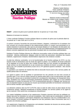 > 18 décembre : en grève pour la journée internationale des migrant·es > Pour la paix : troupes russes hors de toute l’Ukraine ! > Palestine - De qui le plan Trump est-il le nom ? > 18 décembre 2025, Exilé·es et Sans-Papiers : Logement, santé, école, travail, papiers, pour toutes et tous ! > SUD éducation - Djelloul Khéris : Face à l’extrême droite et à ses attaques, exerçons notre solidarité syndicale et interprofessionnelle > SNJ - Plainte en diffamation de Thalès : le SNJ soutient le média Disclose et ses journalistes > SUD INSEE - L’ancien directeur général de l’Insee recyclé en lobbyiste pro-patronal > SUD Rural-Territoires - De nouvelles attaques contre les services de l’État > ASSO-Solidaires - Secteur social : toutes et tous en grève les 16, 17 et 18 décembre 2025 ! > SNJ, SNJ-CGT, CFDT-Journalistes et SGJ-FO soutiennent leurs collègues égyptiens d’Al-Bawabah, en grève depuis un mois > SUD Rural-Territoires - De nouvelles attaques contre les services de l'Etat : protéger les agent-es et répondre à la crise > Solidaires Douanes - 3 pas en avant (restructurations), 3 pas en arrière (Lignes directrices de gestion) ! > SUD Industrie - BRASERO N°59 > Solidaires Informatique - 18 décembre : en grève pour la journée internationale des migrant·es > Solidaires 79 - Communiqué unitaires suites aux violences de la CR à Melle > Compte-rendu AG Unirs 10 décembre 25 > Lettre d'information du collectif national Stop CETA MERCOSUR