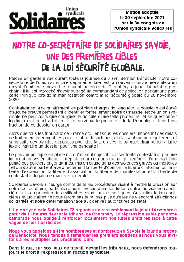 L’Union syndicale Solidaires 73 organise un rassemblement le jeudi 14 octobre à partir de 11 heures devant le tribunal de Chambéry. La répression subie par notre camarade nous oblige à renforcer localement nos luttes unitaires face à cette vague de lois liberticides.