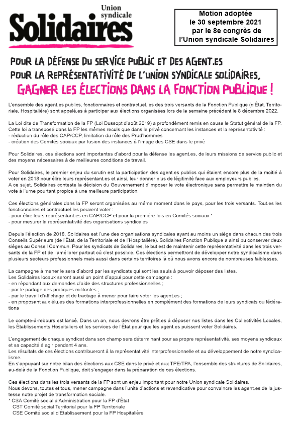 En s’appuyant sur notre bilan des élections aux CSE dans le privé et aux TPE/TPA, l’ensemble des structures de Solidaires, au-delà de la Fonction Publique, doit s’engager dans la préparation de ces élections.