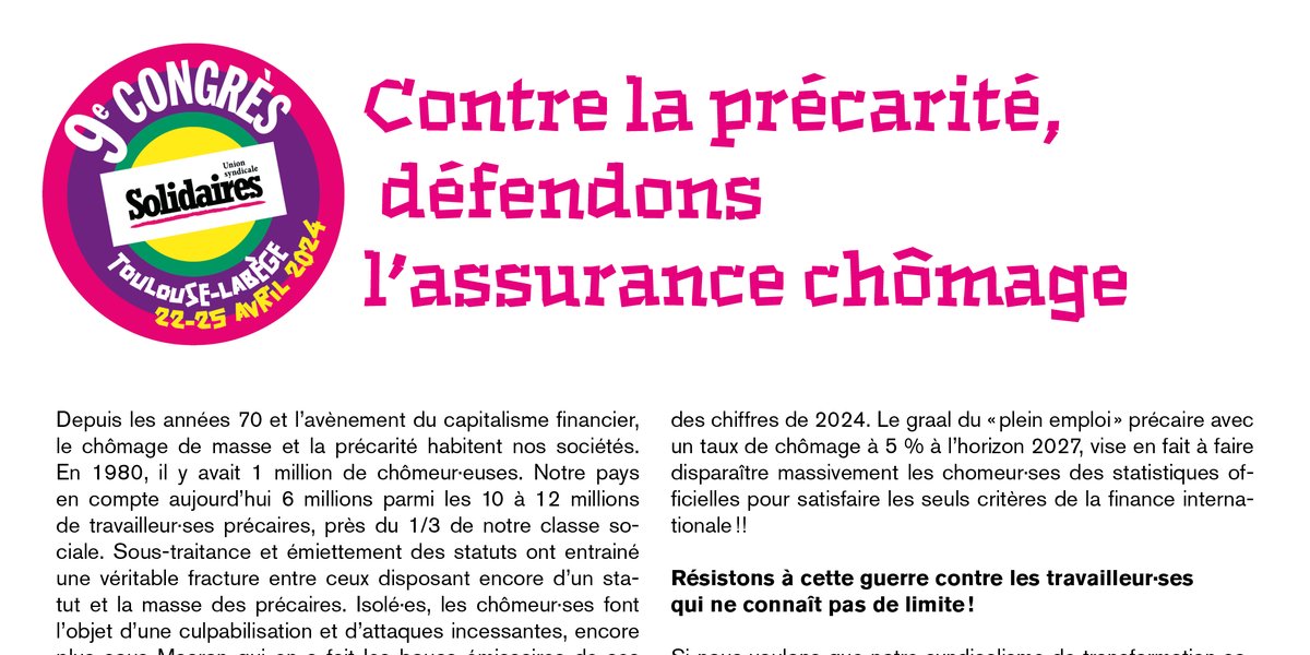Force est pourtant de constater que nous ne nous mobilisons pas assez pour la défense de ce droit essentiel. Les associations et comités de chômeurs et (ou) de précaires) aussi combattifs soient-ils, sont bien trop réduits pour porter seuls cette bataille. C’est bel et bien aux organisations syndicales, à nous toutes et tous, de nous emparer de cette question car elle concerne l’ensemble des travailleur·ses. L’assurance chômage est un droit collectif, et doit être défendue au même titre que la sécu !