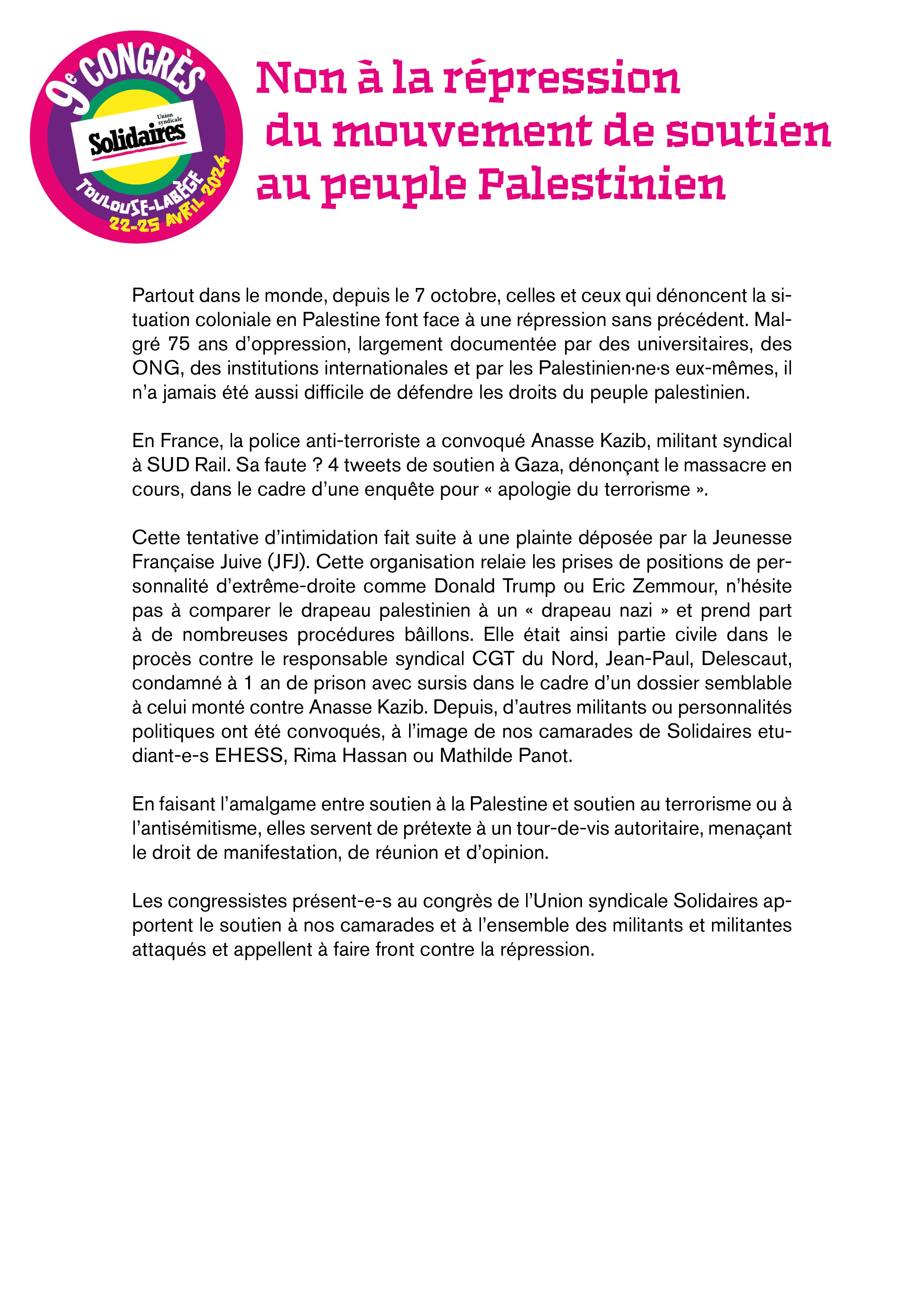 Les congressistes présent-e-s au congrès de l’Union syndicale Solidaires apportent le soutien à nos camarades et à l’ensemble des militants et militantes attaqués et appellent à faire front contre la répression.