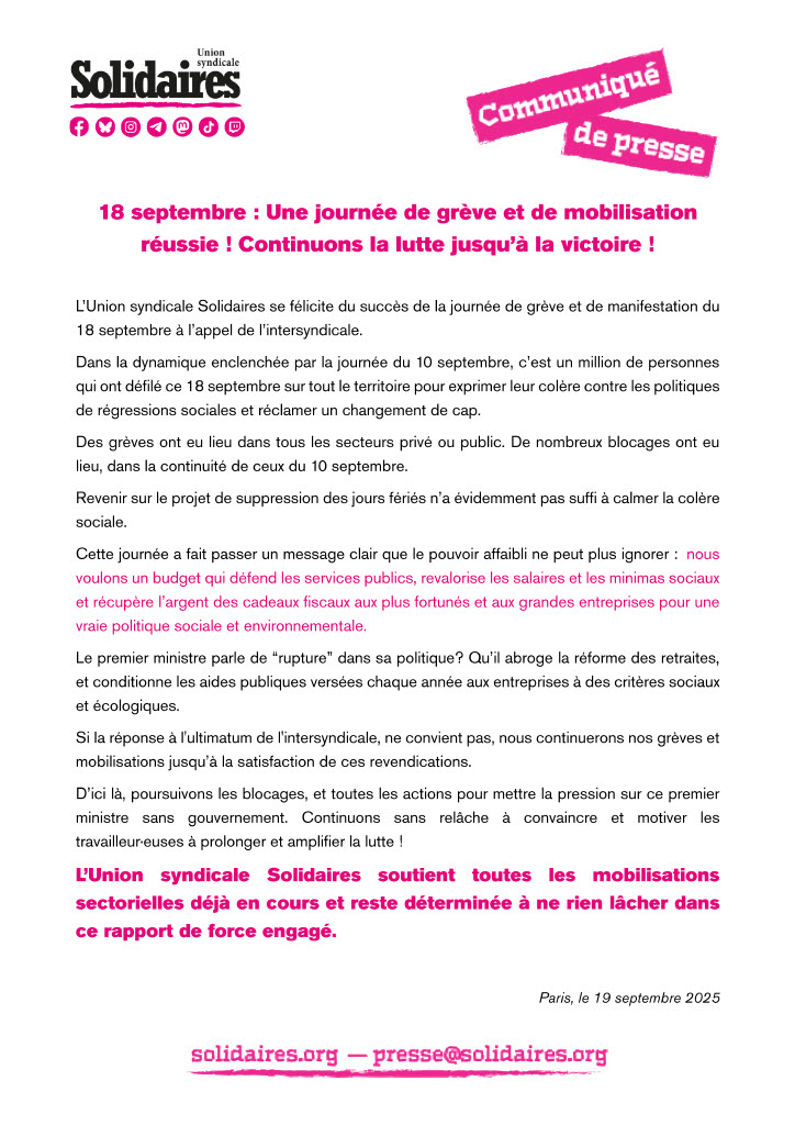 L’Union syndicale Solidaires se félicite du succès de la journée de grève et de manifestation du 18 septembre à l’appel de l’intersyndicale.