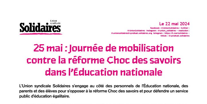 L’Union syndicale Solidaires s’engage au côté des personnels de l’Éducation nationale, des parents et des élèves pour s’opposer à la réforme Choc des savoirs et pour défendre un service public d’éducation égalitaire.