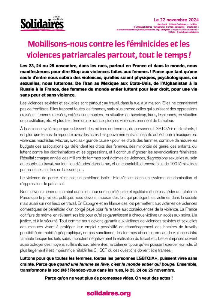 Luttons pour que toutes les femmes, toutes les personnes LGBTQIA+, puissent vivre sans crainte. Parce que quand une femme se lève, c’est le monde entier qui bouge. Ensemble, transformons la société ! Rendez-vous dans les rues, le 23, 24 ou 25 novembre.