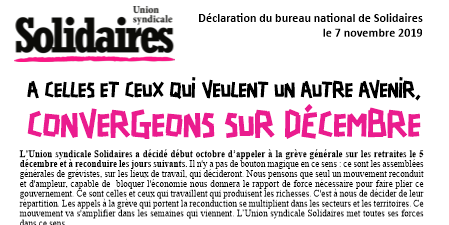 L'Union syndicale Solidaires, réunie en bureau national ce 7 novembre appelle à participer à l'ensemble de ces mobilisations.