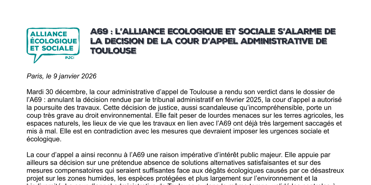 Mardi 30 décembre, la cour administrative d’appel de Toulouse a rendu son verdict dans le dossier de l’A69 : annulant la décision rendue par le tribunal administratif en février 2025, la cour d’appel a autorisé la poursuite des travaux. Cette décision de justice, aussi scandaleuse qu’incompréhensible, porte un coup très grave au droit environnemental. Elle fait peser de lourdes menaces sur les terres agricoles, les espaces naturels, les lieux de vie que les travaux en lien avec l’A69 ont déjà très largement saccagés et mis à mal. Elle est en contradiction avec les mesures que devraient imposer les urgences sociale et écologique.