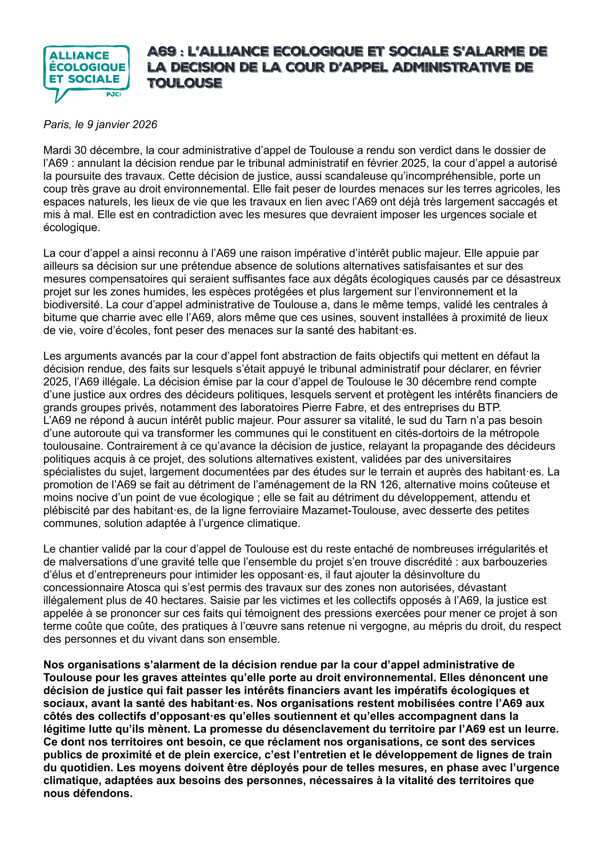 Les arguments avancés par la cour d’appel font abstraction de faits objectifs qui mettent en défaut la décision rendue, des faits sur lesquels s’était appuyé le tribunal administratif pour déclarer, en février 2025, l’A69 illégale. La décision émise par la cour d’appel de Toulouse le 30 décembre rend compte d’une justice aux ordres des décideurs politiques, lesquels servent et protègent les intérêts financiers de grands groupes privés, notamment des laboratoires Pierre Fabre, et des entreprises du BTP. L’A69 ne répond à aucun intérêt public majeur. Pour assurer sa vitalité, le sud du Tarn n’a pas besoin d’une autoroute qui va transformer les communes qui le constituent en cités-dortoirs de la métropole toulousaine. Contrairement à ce qu’avance la décision de justice, relayant la propagande des décideurs politiques acquis à ce projet, des solutions alternatives existent, validées par des universitaires spécialistes du sujet, largement documentées par des études sur le terrain et auprès des habitant·es. La promotion de l’A69 se fait au détriment de l’aménagement de la RN 126, alternative moins coûteuse et moins nocive d’un point de vue écologique ; elle se fait au détriment du développement, attendu et plébiscité par des habitant·es, de la ligne ferroviaire Mazamet-Toulouse, avec desserte des petites communes, solution adaptée à l’urgence climatique.