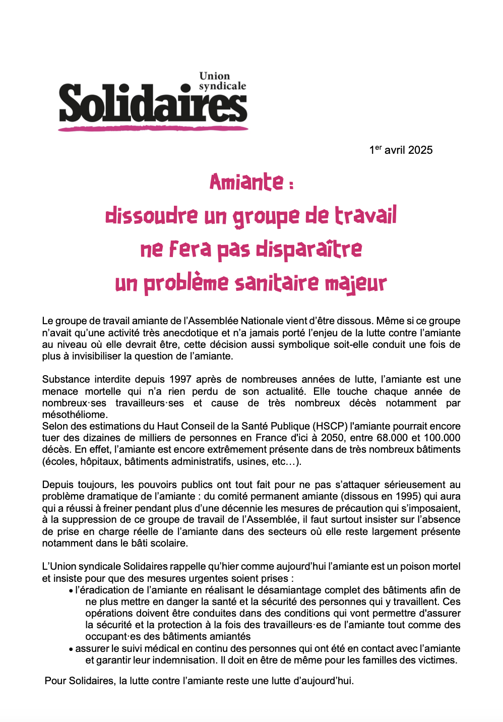 L’Union syndicale Solidaires rappelle qu’hier comme aujourd’hui l’amiante est un poison mortel et insiste pour que des mesures urgentes soient prises :