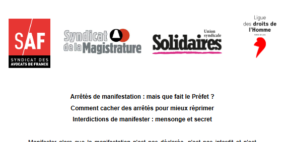Communiqué unitaire SAF SM Solidaires LDH suite eu dépôt par nos 4 organisations d'un référé liberté contre le dernier arrêté en date du Préfet de Police de Paris interdisant les manifs non déclarées.