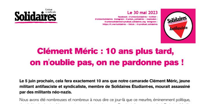 Le 5 juin prochain, cela fera exactement 10 ans que notre camarade Clément Méric, jeune militant antifasciste et syndicaliste, membre de Solidaires Étudiant·es, mourait assassiné par des militants néo-nazis.
