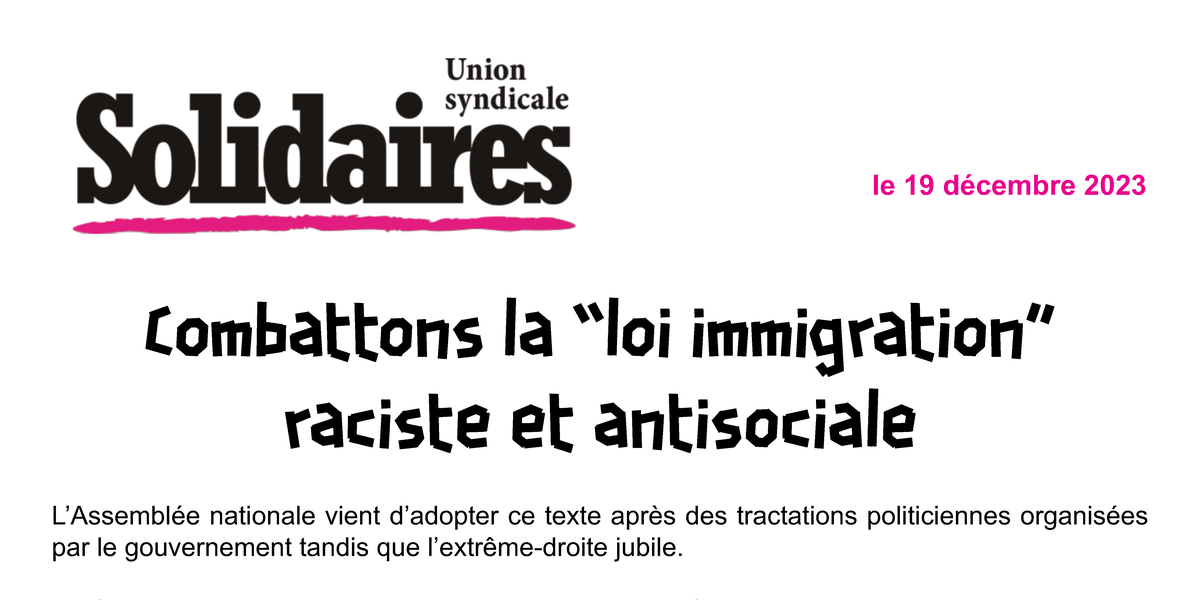 L’Union syndicale Solidaires lutte depuis des mois contre ce projet de loi. Nous avons participé activement au cadre unitaire UCIJ, Unis contre une immigration jetable, pour repousser cette loi et porter une politique migratoire d’accueil et solidaires. L’urgence c’est de régulariser les travailleurs et travailleuses sans-papiers trop souvent exploité·es, sous la menace d’une arrestation sur le chemin du travail. Cette loi n’y répond pas. L’urgence c’est de ne laisser personne à la rue. L’urgence c’est de donner les moyens aux services publics. L’urgence c’est les augmentations de salaires, le partage des richesses et la lutte contre la crise écologique, pas une énième loi sécuritaire et xénophobe.