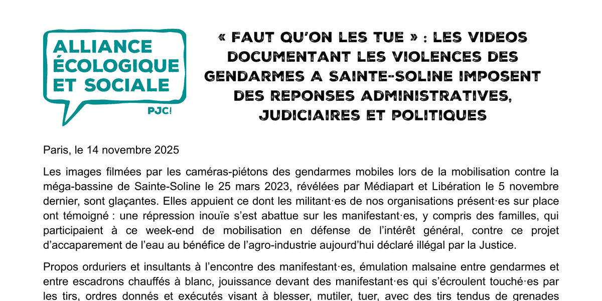 Les images filmées par les caméras-piétons des gendarmes mobiles lors de la mobilisation contre la méga-bassine de Sainte-Soline le 25 mars 2023, révélées par Médiapart et Libération le 5 novembre dernier, sont glaçantes. Elles appuient ce dont les militant·es de nos organisations présent·es sur place ont témoigné : une répression inouïe s’est abattue sur les manifestant·es, y compris des familles, qui participaient à ce week-end de mobilisation en défense de l’intérêt général, contre ce projet d’accaparement de l’eau au bénéfice de l’agro-industrie aujourd’hui déclaré illégal par la Justice.