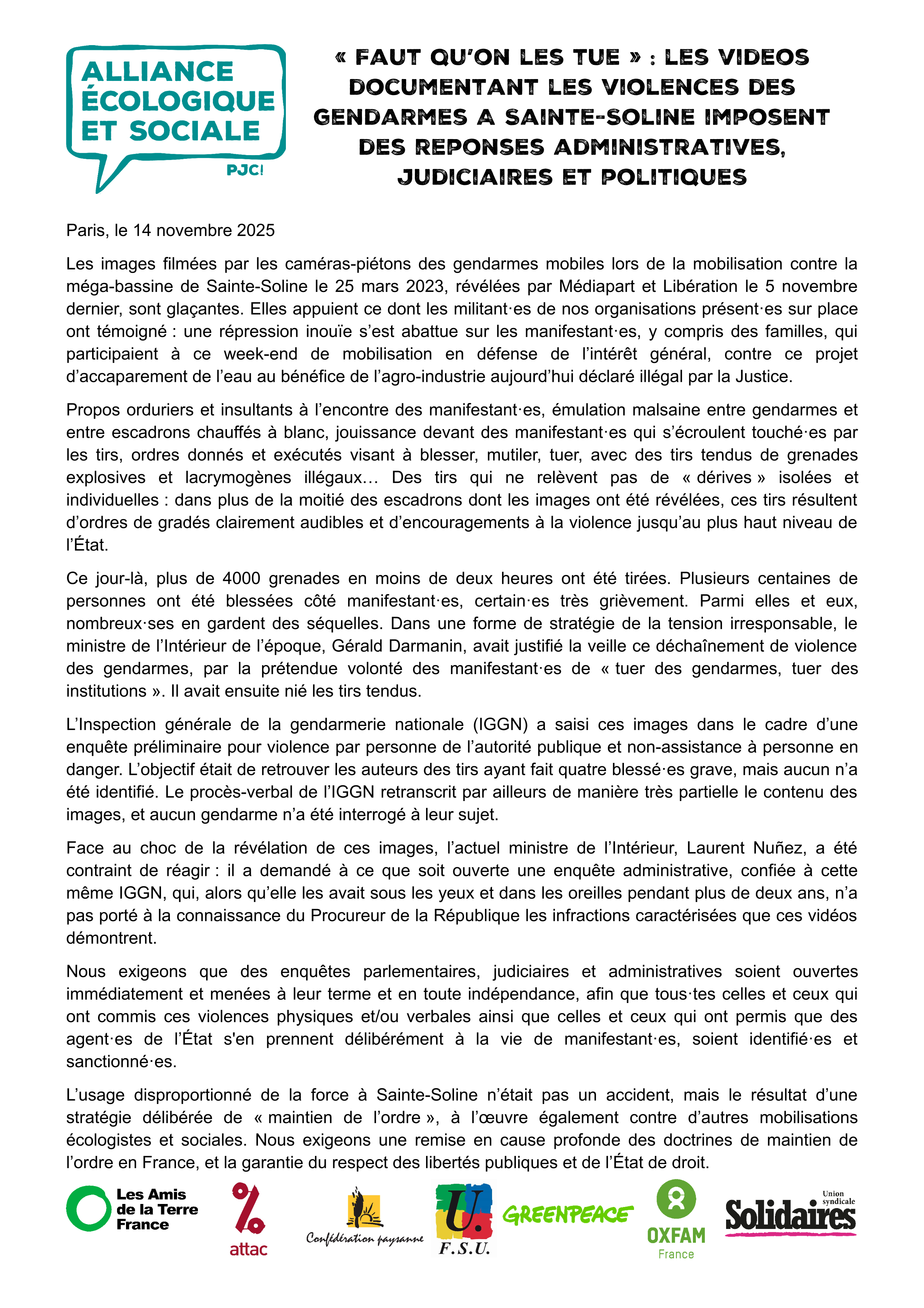 L’usage disproportionné de la force à Sainte-Soline n’était pas un accident, mais le résultat d’une stratégie délibérée de « maintien de l’ordre », à l’œuvre également contre d’autres mobilisations écologistes et sociales. Nous exigeons une remise en cause profonde des doctrines de maintien de l’ordre en France, et la garantie du respect des libertés publiques et de l’État de droit.