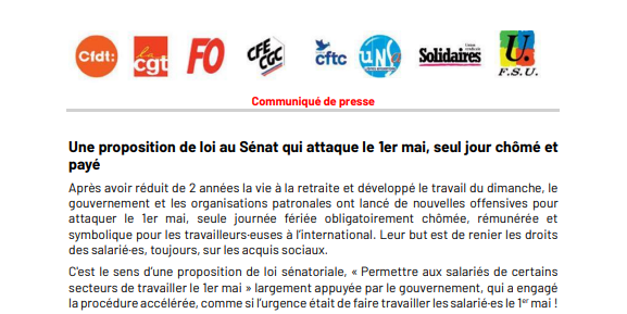 C'est le sens d’une proposition de loi sénatoriale, « Permettre aux salariés de certains secteurs de travailler le 1er mai » largement appuyée par le gouvernement, qui a engagé la procédure accélérée, comme si l’urgence était de faire travailler les salarié·es le 1er mai !