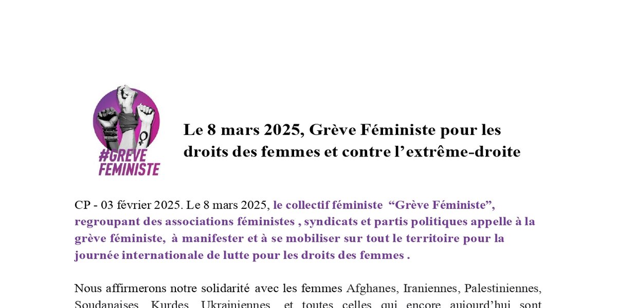 CP - 03 février 2025. Le 8 mars 2025, le collectif féministe “Grève Féministe”, regroupant des associations féministes , syndicats et partis politiques appelle à la grève féministe, à manifester et à se mobiliser sur tout le territoire pour la journée internationale de lutte pour les droits des femmes .