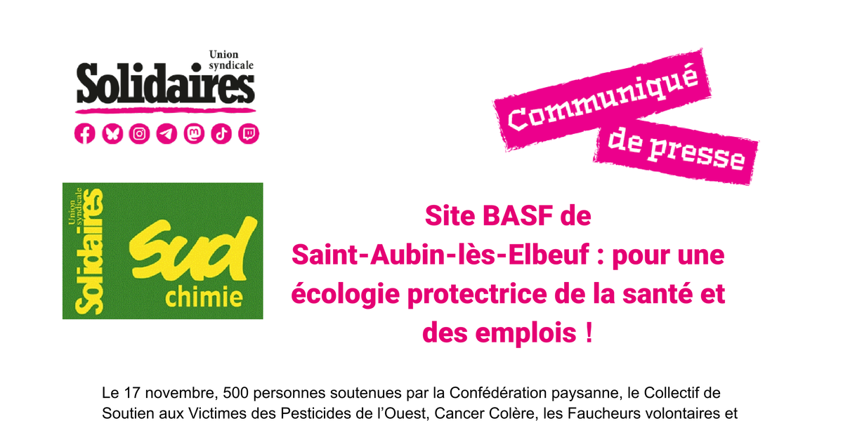 Le 17 novembre, 500 personnes soutenues par la Confédération paysanne, le Collectif de Soutien aux Victimes des Pesticides de l’Ouest, Cancer Colère, les Faucheurs volontaires et les Soulèvements de la Terre sont entrées sur le site de l’entreprise BASF à Saint-Aubin-lès-Elbeuf, qui produit notamment des pesticides interdits en Europe mais autorisés à l’exportation, comme le Fipronil, et rejette des polluants éternels dans la Seine.