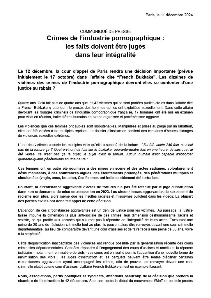 Nous, associations, partis politiques et syndicats, attendons beaucoup de la décision que prendra la chambre de l’instruction le 12 décembre. Sept ans après le début du mouvement #MeToo, en plein procès des violeurs de Mazan, nous ne pouvons accepter que les viols soient encore minimisés par l’institution judiciaire et des victimes sacrifiées pour des motifs budgétaires.