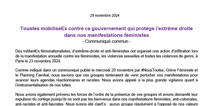 Nous sommes inquiètEs mais nous n’avons pas peur. Nous appelons toutes les organisations féministes mais aussi anti-fascistes, écologistes, syndicales ainsi que l’ensemble du mouvement social à se réunir et à se mobiliser dès maintenant contre ce gouvernement qui protège l’extrême-droite et soutient le fémonationalisme. Nous nous joignons également à l’appel de la coordination féministe à se mettre en grève le 25 janvier 2025 pour battre l’extrême-droite.