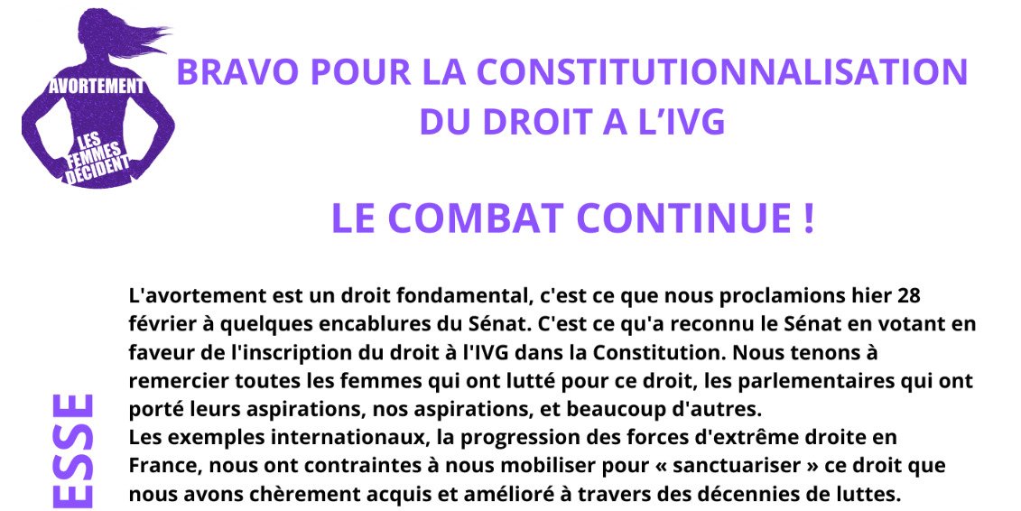 L'avortement est un droit fondamental, c'est ce que nous proclamions hier 28 février à quelques encablures du Sénat. C'est ce qu'a reconnu le Sénat en votant en faveur de l'inscription du droit à l'IVG dans la Constitution. Nous tenons à remercier toutes les femmes qui ont lutté pour ce droit, les parlementaires qui ont porté leurs aspirations, nos aspirations, et beaucoup d'autres.