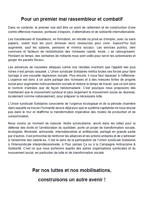 Dans ce contexte, le premier mai doit être un point de ralliement et de construction d’une contre-offensive massive, porteuse d’espoirs, d’alternatives et de solidarité internationaliste.