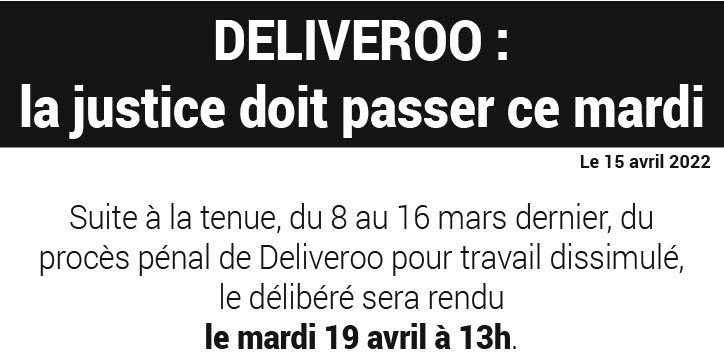 Suite à la tenue, du 8 au 16 mars dernier, du procès pénal de Deliveroo pour travail dissimulé, le délibéré sera rendu le mardi 19 avril à 13h.