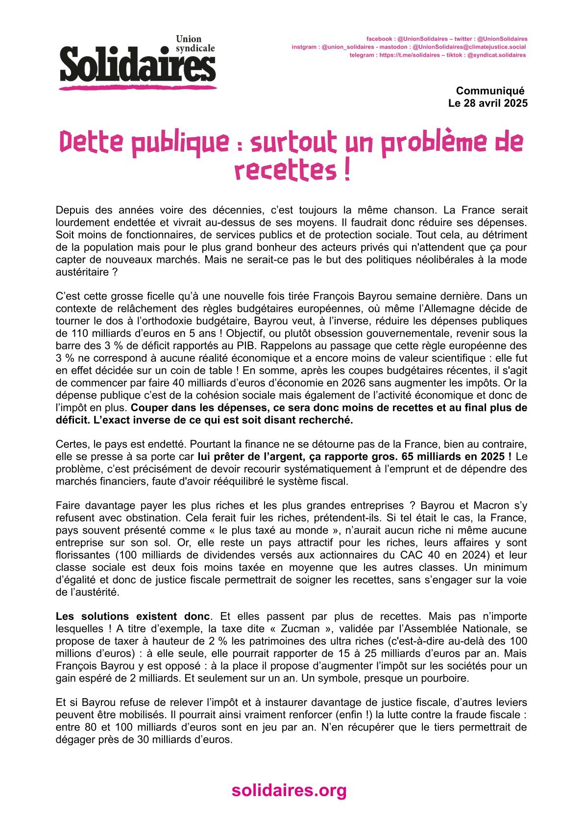 Pour l’Union syndicale Solidaires, les pistes de recettes sont donc nombreuses. Et ce sont elles qui doivent empruntées ! Elles passent par l’impôt et la justice fiscale, mais également par cesser les dépenses qui ne sont d’aucune utilité pour le bien commun. Solidaires revendique que la priorité des dépenses publiques, ce soient les services publics et la protection sociale. Sans compter que dépenser plus pour les services publics, c’est enfin lutter contre le désespoir social et l’extrême droite.
