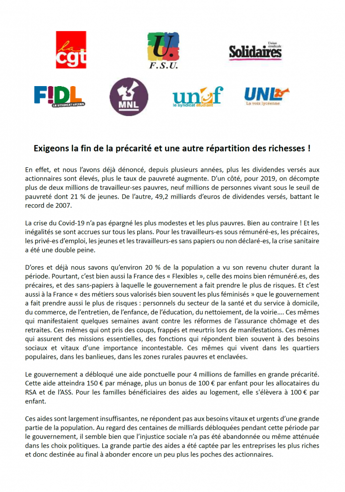 Exigeons la fin de la précarité et une autre répartition des richesses !