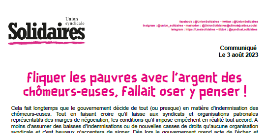Toutes ces mesures antisociales ont abouti à ce que, malgré plusieurs millions de chômeurs-euses dans ce pays, l’UNEDIC qui gère l’assurance chômage soit excédentaire ! Ce qui donne un nouveau prétexte au gouvernement pour récupérer ces excédents de plusieurs milliards d’euros non pas pour indemniser les chômeurs-euses … mais pour financer France Travail, la nouvelle trouvaille destinée à fliquer les allocataires du RSA et les obliger à travailler au risque de perdre leurs maigres revenus !
