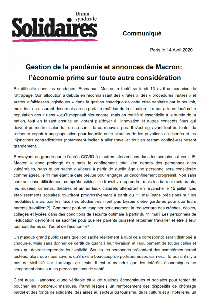Renvoyant en grande partie l’après COVID à d’autres interventions dans les semaines à venir, E. Macron a donc prolongé d’un mois le confinement total, (en dehors des personnes dites vulnérables, sans qu’on sache d’ailleurs à partir de quel âge une personne sera considérée comme âgée), le 11 mai étant la date prévue pour engager un déconfinement progressif. Non sans contradictions difficilement compréhensibles : le travail va reprendre, mais les bars et restaurants, les musées, cinémas, théâtres et autres lieux culturels attendront en revanche le 15 juillet. Les établissements scolaires rouvriront progressivement à partir du 11 mai (sans précisions sur les modalités), mais pas les facs (les étudiant-es n’ont pas besoin d’être gardé-es pour que leurs parents travaillent?). Comment peut-on imaginer sérieusement la réouverture des crèches, écoles, collèges et lycées dans des conditions de sécurité optimale à partir du 11 mai? Les personnels de l’éducation devront-ils se sacrifier pour que les parents puissent retourner travailler et être à leur tour sacrifié-es sur l’autel de l’économie?