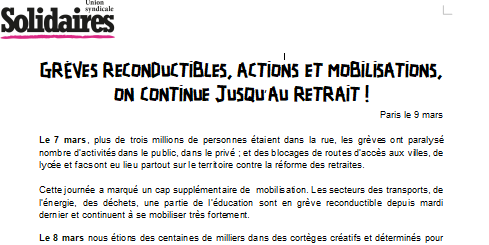Solidaires appelle avec l’intersyndicale unie et déterminée à manifester encore plus massivement contre la réforme avec l’ensemble de la population dès le samedi 11 mars et à être tous et toutes en grève et dans la rue le 15 mars prochain, journée où la commission paritaire mixte (Assemblée nationale/Sénat) finalisera le texte de la réforme des retraites.