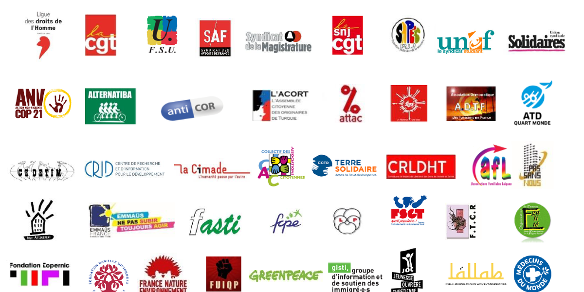 Ligue des droits de l'Homme (LDH), Confédération générale du travail (CGT), Fédération syndicale unitaire (FSU), Syndicat des avocats de France (Saf), Syndicat de la magistrature (SM), Syndicat national des journalistes (SNJ-CGT), Syndicat national des personnels de l'éducation et du social à la protection judiciaire de la jeunesse (SNPES-PJJ/FSU), Union nationale des étudiants de France (Unef), Union syndicale Solidaires, Action non violente – Cop21 (ANV-Cop21), Alternatiba, Anticor, Assemblée citoyenne originaires de Turquie (Acort), Association pour la taxation des transactions financières et pour l'action citoyenne (Attac), Association des travailleurs Maghrébins de France (ATMF), Association des Tunisiens de France (ADTF), ATD Quart monde, Centre d'études et d'initiatives de solidarité internationale (Cedetim), Centre de recherche et d’information pour le développement (Crid), la Cimade, Collectif des associations citoyennes (Cac), Comité catholique contre la faim et pour le développement (CCFD-Terre solidaire), Comité pour le respect des libertés et des droits de l'Homme en Tunisie (CRLDHT), Conseil national des associations familiales laïques (Cnafal), Coordination nationale Pas sans nous, Droit au logement (Dal), Emmaüs France, Fédération des associations de solidarité avec tous-tes les immigré-e-s (Fasti), Fédération des conseils de parents d'élèves (FCPE), Fédération nationale de la Libre Pensée, Fédération sportive et gymnique du travail (FSGT), Fédération des Tunisiens pour une citoyenneté des deux rives (FTCR), Femmes égalité, Fondation Copernic, Fondation Danielle Mitterrand, France nature environnement (FNE), Front uni des immigrations et des quartiers populaires (FUIQP), Greenpeace France, Groupe d'information et de soutien des immigrés (Gisti), Jeunesse ouvrière chrétienne (Joc), Lallab, Médecins du Monde, Memorial 98, Mouvement contre le racisme et pour l'amitié entre les peuples (Mrap), Mouvement rural de jeunesse chrétienne (MRJC), les Petits débrouillards, le Planning familial, la Quadrature du net, Secours catholique - Caritas France, SOS Racisme.Signatures individuelles, premiers signataires :