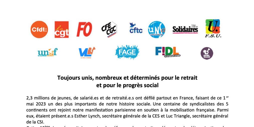2,3 millions de jeunes, de salarié.es et de retraité.e.s ont défilé partout en France, faisant de ce 1er mai 2023 un des plus importants de notre histoire sociale. Une centaine de syndicalistes des 5 continents ont rejoint notre manifestation parisienne en soutien à la mobilisation française. Parmi eux, étaient présent.e.s Esther Lynch, secrétaire générale de la CES et Luc Triangle, secrétaire général de la CSI.