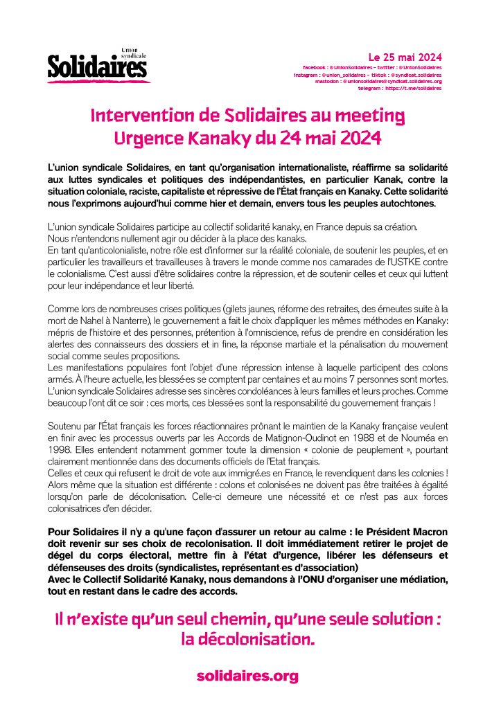 L’union syndicale Solidaires participe au collectif solidarité kanaky, en France depuis sa création.