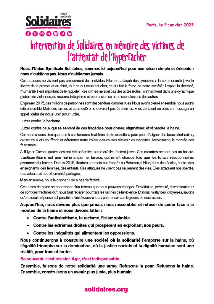 Nous, l’Union Syndicale Solidaires, sommes ici aujourd’hui pour une raison simple et évidente : nous n’oublions pas. Nous n’oublierons jamais.