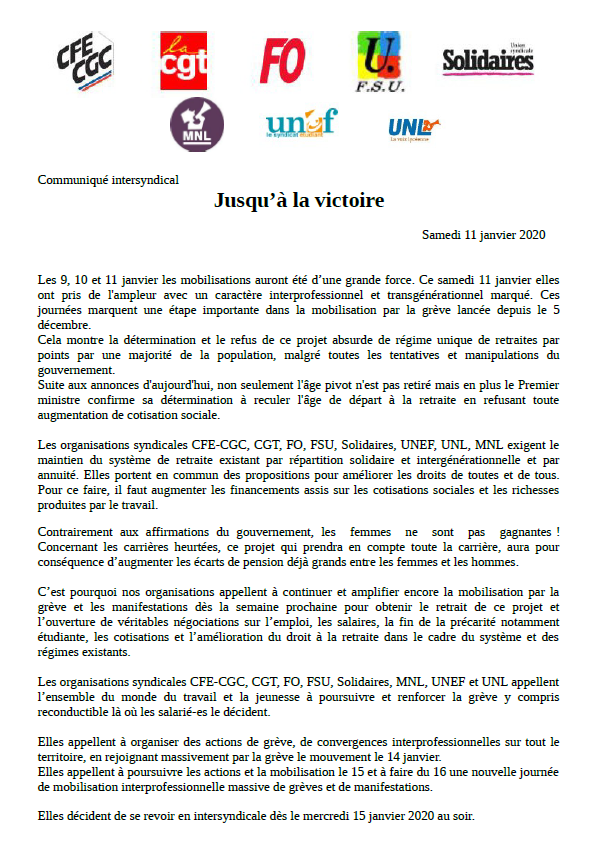 Les 9, 10 et 11 janvier les mobilisations auront été d’une grande force. Ce samedi 11 janvier elles ont pris de l'ampleur avec un caractère interprofessionnel et transgénérationnel marqué. Ces journées marquent une étape importante dans la mobilisation par la grève lancée depuis le 5 décembre.