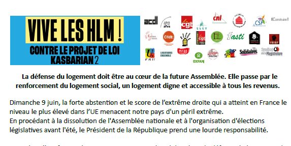 Collectif « Vive les HLM » : ACDL, AFVS, CFDT, CGT, CLCV, CNL, CAU, Construire !, Converg. nat. services publics, CNAFAL, CSF, DAL, FAP, FASTI, Femmes égalité, FSU, FUIQP, Indecosa-CGT, MRAP, OXFAM, Plate-forme Logement, Solidaires, SM, SNUP Habitat, Stop démolitions ...