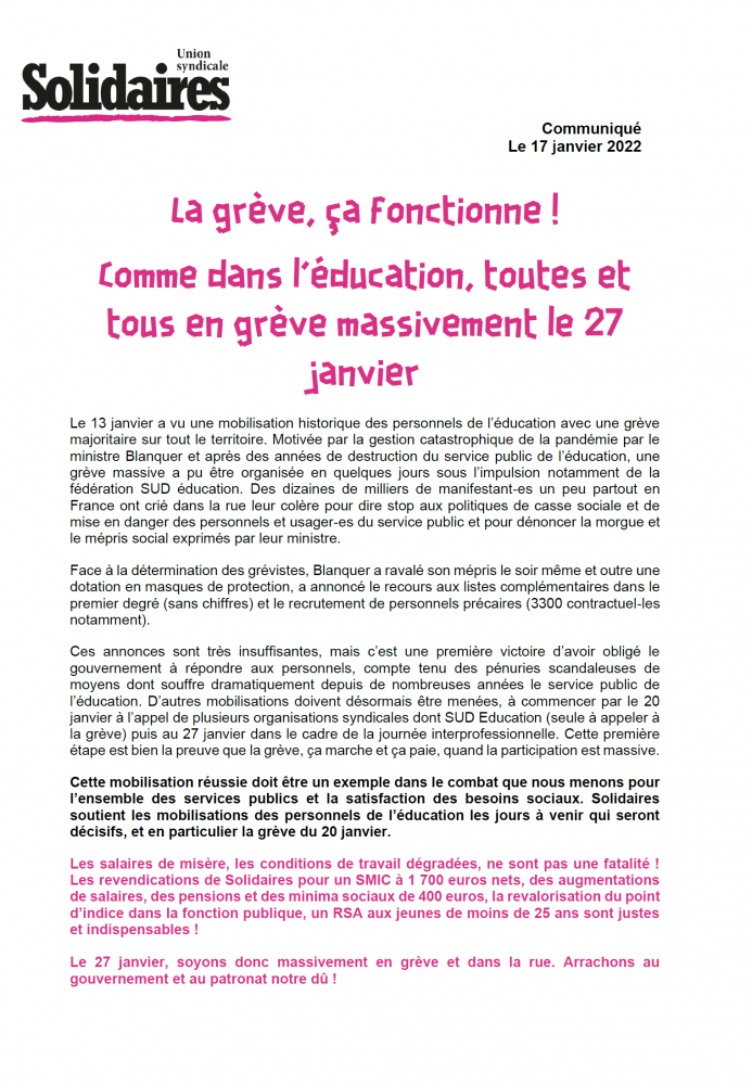 Ces annonces sont très insuffisantes, mais c’est une première victoire d’avoir obligé le gouvernement à répondre aux personnels, compte tenu des pénuries scandaleuses de moyens dont souffre dramatiquement depuis de nombreuses années le service public de l’éducation. D’autres mobilisations doivent désormais être menées, à commencer par le 20 janvier à l’appel de plusieurs organisations syndicales dont SUD Education (seule à appeler à la grève) puis au 27 janvier dans le cadre de la journée interprofessionnelle. Cette première étape est bien la preuve que la grève, ça marche et ça paie, quand la participation est massive.