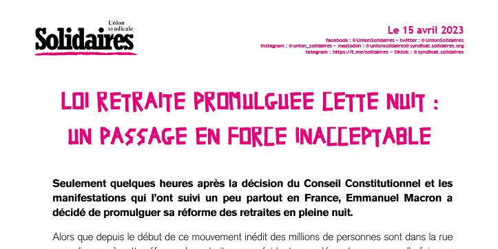 Alors que depuis le début de ce mouvement inédit des millions de personnes sont dans la rue pour dire non à cette réforme des retraites, ce président nous démontre une nouvelle fois son mépris total à l’encontre de la jeunesse, des travailleurs∙euses et des retraité∙es. Il n’entend rien depuis le début de ce mouvement et persiste à mettre de l’huile sur le feu en promulguant sa loi alors que l’intersyndicale a renouvelé hier soir sa demande solennelle de ne pas la promulguer.