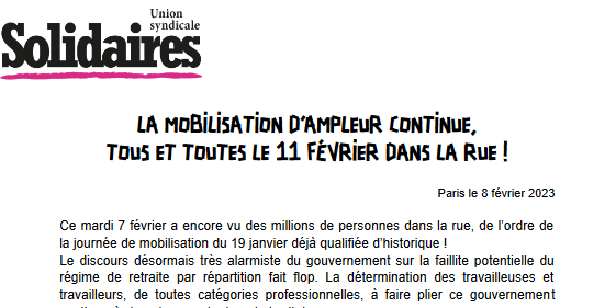 Soyons encore plusieurs millions de travailleuses, travailleurs, retraité-es, et de toutes générations, dans la rue, et/ou en grève, ce samedi 11 février.