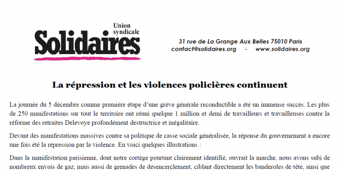 Enfin, hier samedi 7 décembre, la police à Paris a empêché violemment la convergence entre gilets et jaunes et syndicalistes. Ainsi, à Nantes, dès le début de la manifestation à 14h les forces de l'ordre ont gazé le cortège et ont procédé à de nombreuses arrestations de manifestant-es dont un de nos camarades de Solidaires informatique qui s’interposait pour protéger une manifestante.
