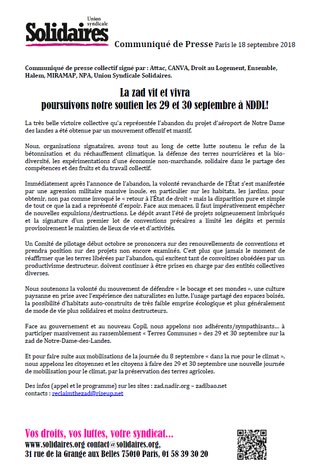 Nous, organisations signataires, avons tout au long de cette lutte soutenu le refus de la bétonnisation et du réchauffement climatique, la défense des terres nourricières et la bio-diversité, les expérimentations d’une économie non-marchande, solidaire dans le partage des compétences et des fruits et du travail collectif.