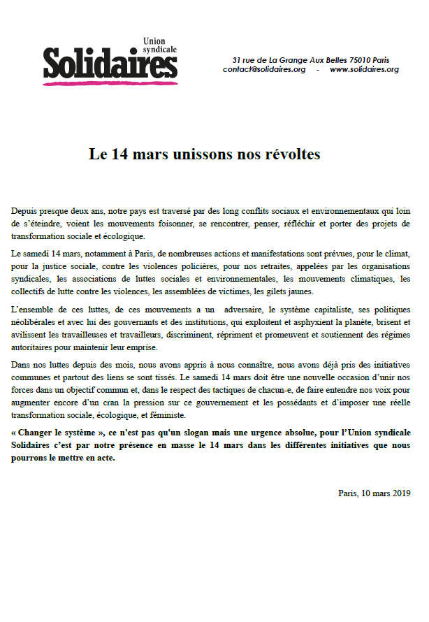 « Changer le système », ce n'est pas qu'un slogan mais une urgence absolue, pour l’Union syndicale Solidaires c’est par notre présence en masse le 14 mars dans les différentes initiatives que nous pourrons le mettre en acte.