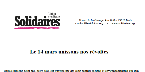 Dans nos luttes depuis des mois, nous avons appris à nous connaître, nous avons déjà pris des initiatives communes et partout des liens se sont tissés. Le samedi 14 mars doit être une nouvelle occasion d’unir nos forces dans un objectif commun et, dans le respect des tactiques de chacun-e, de faire entendre nos voix pour augmenter encore d’un cran la pression sur ce gouvernement et les possédants et d’imposer une réelle transformation sociale, écologique, et féministe.