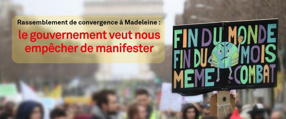 Nous déposons une requête en référé liberté contre l'interdiction de manifester et maintenons notre appel à rassemblement, pour marquer et construire la convergence entre nos mouvements. Nous invitons habitant.es, citoyen.ne.s, gilets jaunes, organisations environnementales, syndicales et mouvements sociaux à se retrouver demain, samedi 21 septembre à 9h Place de la Madeleine pour porter collectivement la convergence nécessaire entre nos mouvements.