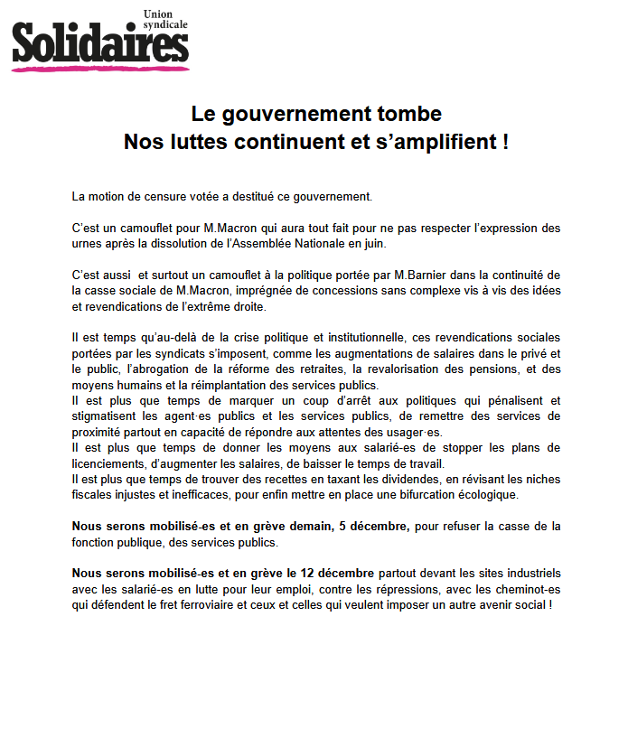 Il est temps qu’au-delà de la crise politique et institutionnelle, ces revendications sociales portées par les syndicats s’imposent, comme les augmentations de salaires dans le privé et le public, l’abrogation de la réforme des retraites, la revalorisation des pensions, et des moyens humains et la réimplantation des services publics.
